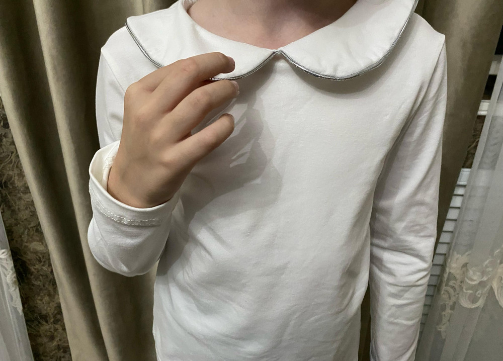 Дизайн модели дополнен кантом с серебряным люрексом по краю воротника, который придаёт лёгкий блеск и делает блузку более нарядной. Классический воротник сохраняет строгий стиль, соответствующий школьному дресс-коду, а застёжка на пуговицу сзади облегчает надевание и добавляет аккуратный декоративный элемент в спинке изделия.